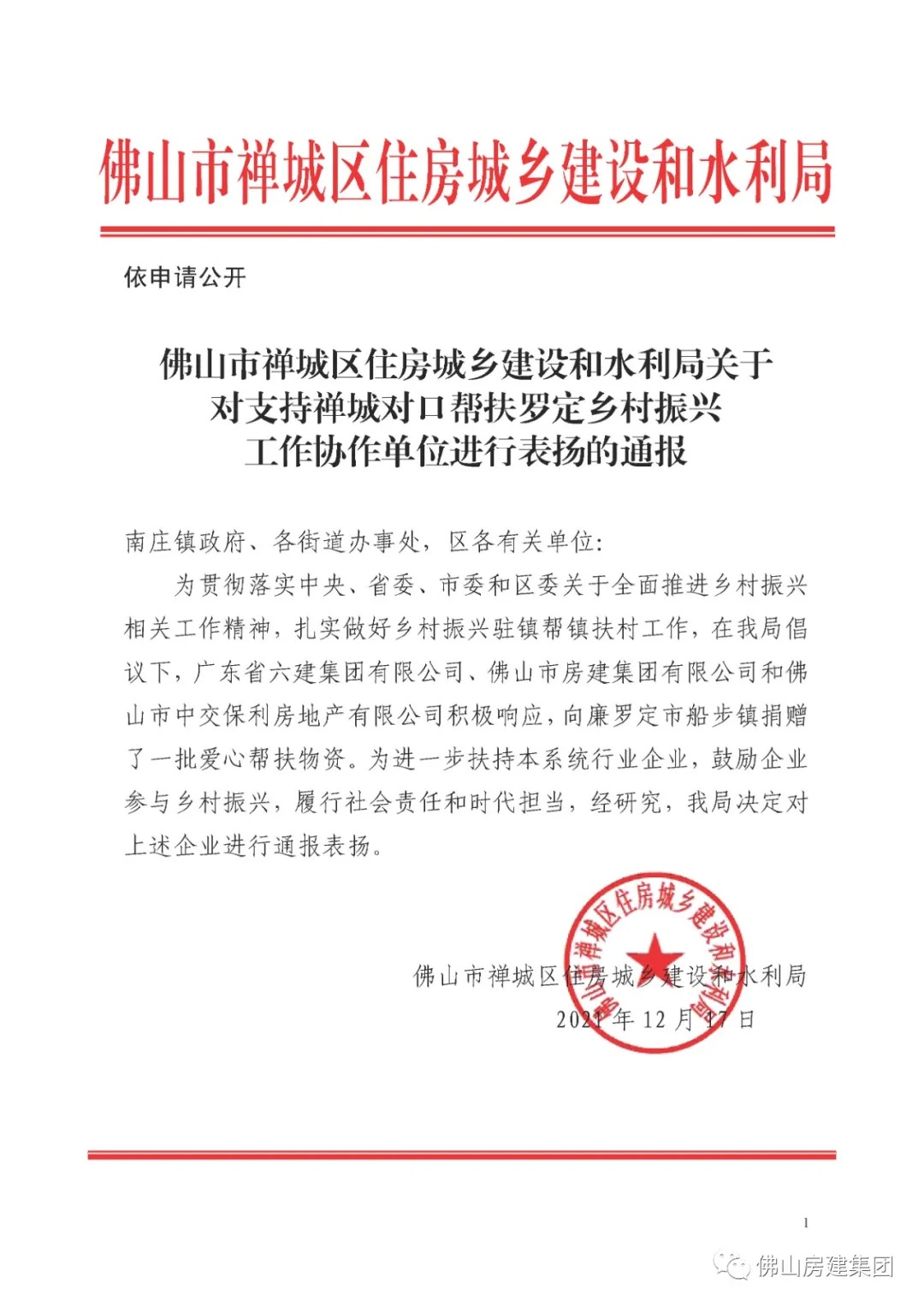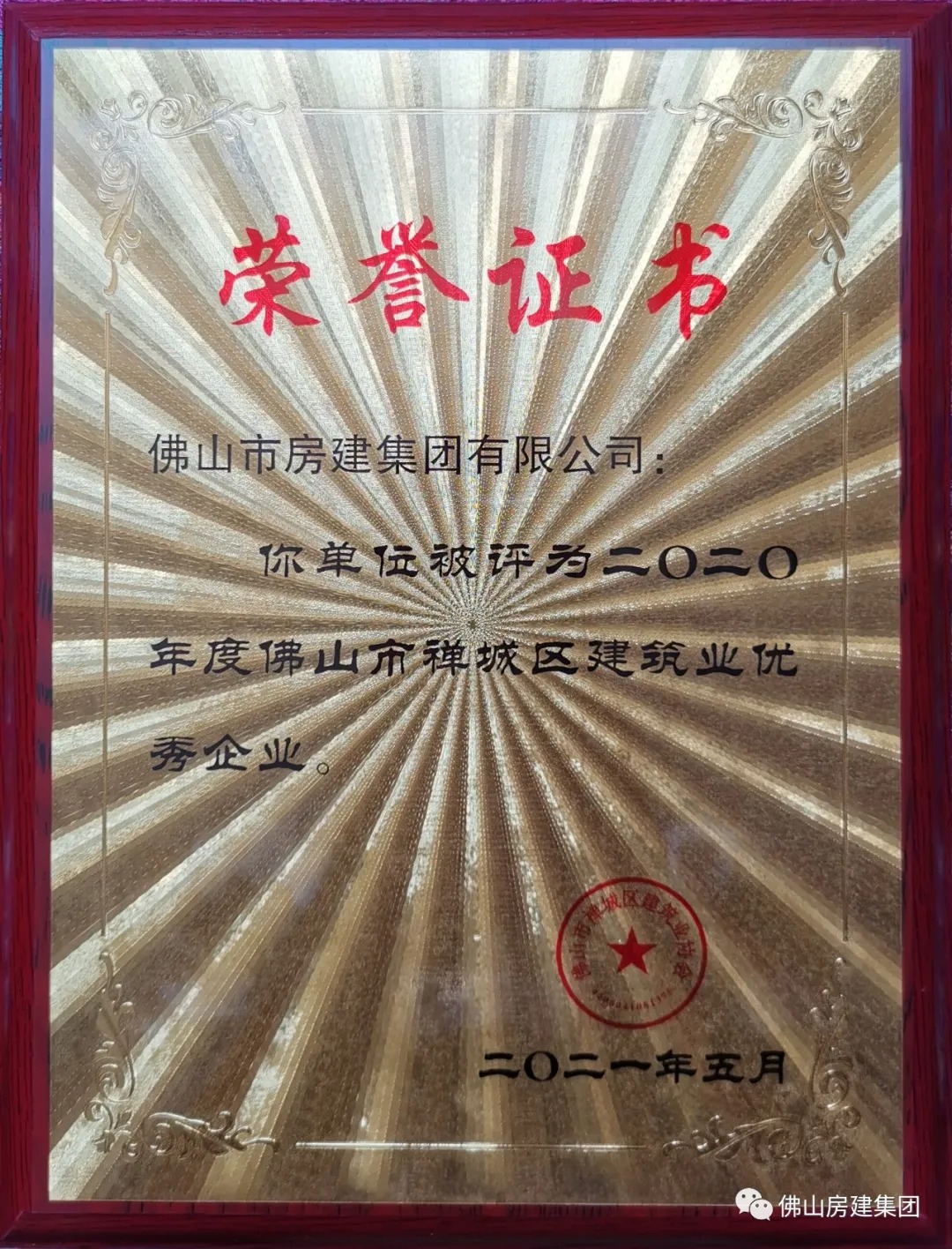 2021年,房建公司面对艰巨的任务,承受巨大的压力和挑战,在政府部门的有力支持下,在公司董事会的带领下,全体员工团结一致,辛勤奉献,锐意进取,不畏艰难,克服种种困难,在政治上、经济上经受住考验,企业取得良好成绩,经济效益上了一个台阶,完成生产总值25亿元,缴纳税金近6千万元,公司全年诚信加分52次(加477分),并保持了佛山市、区级优秀施工企业称号。企业诚信等级多年保持A级,在业内保持良好的信誉。获得佛山市建设工程优质结构奖1项,佛山市建设工程优质奖2项。工程竣工合格率和安全评价合格率保持100% 。关注民生、参与社会公益活动、履行企业社会责任。积极响应政府号召,参与乡村振兴工作,2021年先后进行了3次结对帮扶行动,捐赠扶贫款。支持我市体育事业,参与赞助佛山市第十届运动会。这些履行企业社会责任行动,得到了村民、市民和政府部门的认可肯定。多个在建项目,如仁寿寺提升改造项目、禅城区公共空间及慢行系统示范路提升工程项目、佛山警察历史博物馆等工程在建设过程中表现突出,受到政府部门的通报表扬。