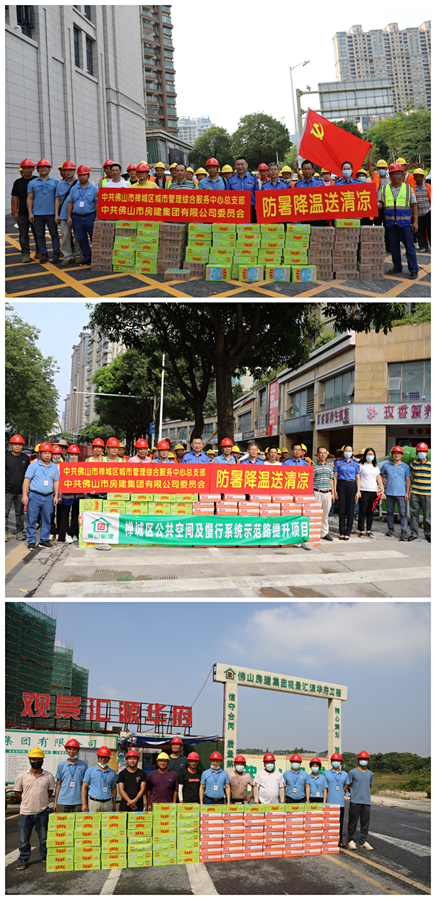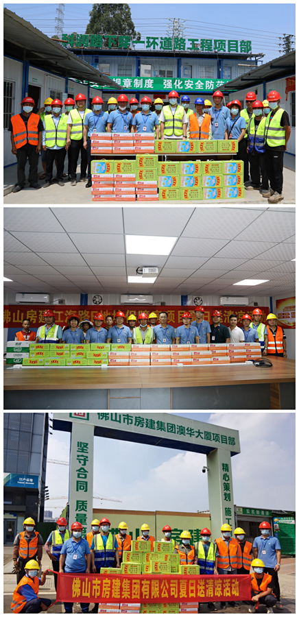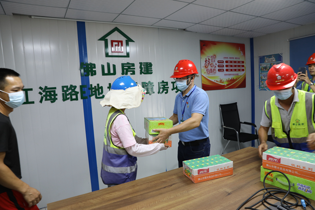 公司党委及工会派出代表兵分多路,深入我司江海路保障房项目、科润路项目、禅城区慢行空间示范路项目、三水观景汇源华府项目等多个重点工程、重点项目,为高温下坚守岗位的施工一线人员送去防暑降温用品,并向他们表达了亲切的问候。同时我司也积极履行社会责任,党员志愿者为沙塘社区快递小哥驿站捐赠了一批清凉饮料。