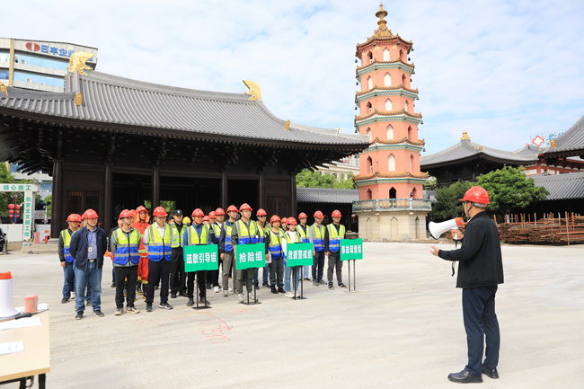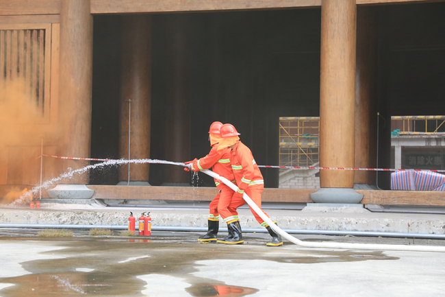 此次演练共模拟了两个情景,一为施工人员在宿舍区内违规私拉乱接电线,外出时未拔除用电设备,电线过热引起火灾;二为针对仁寿寺多为木结构建筑的项目特点,模拟现场油漆作业人员在殿内作业时不小心引燃周边物品引发火灾。